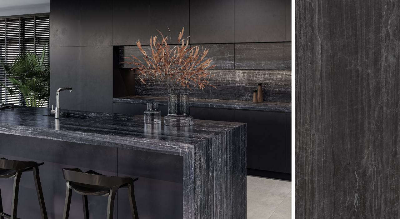 Na série Nero Caressi, a Roca Cerámica reproduz o mármore homônimo, famoso por seu fundo negro e veios brancos extraído na Turquia. Disponível no acabamento Mate e formato 120 x 250 cm, pode ser instalado em bancadas de cozinhas e banheiros | Foto: Divulgação |