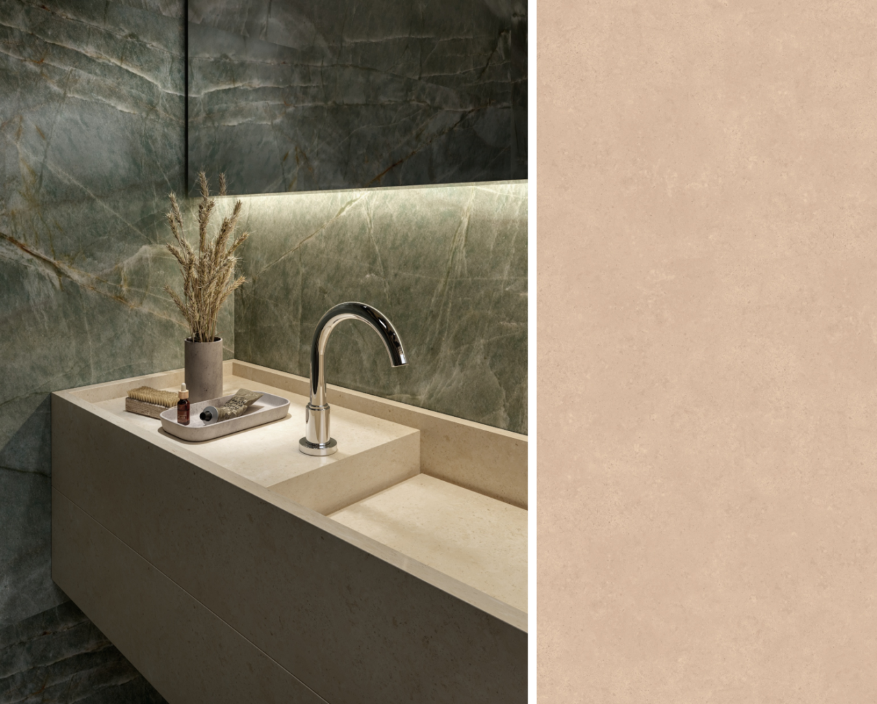 Nessa bancada com cuba esculpida, a estética suave e elegante se encontra na série Cross Cut, da Roca Cerámica. Com referências ao mármore Travertino de mesmo nome, no catálogo o material é disponibilizado na medida 120 x 120 cm, no acabamento mate, e 120 x 250 cm no Micro Crystal | Foto: Divulgação Roca Cerámica |
